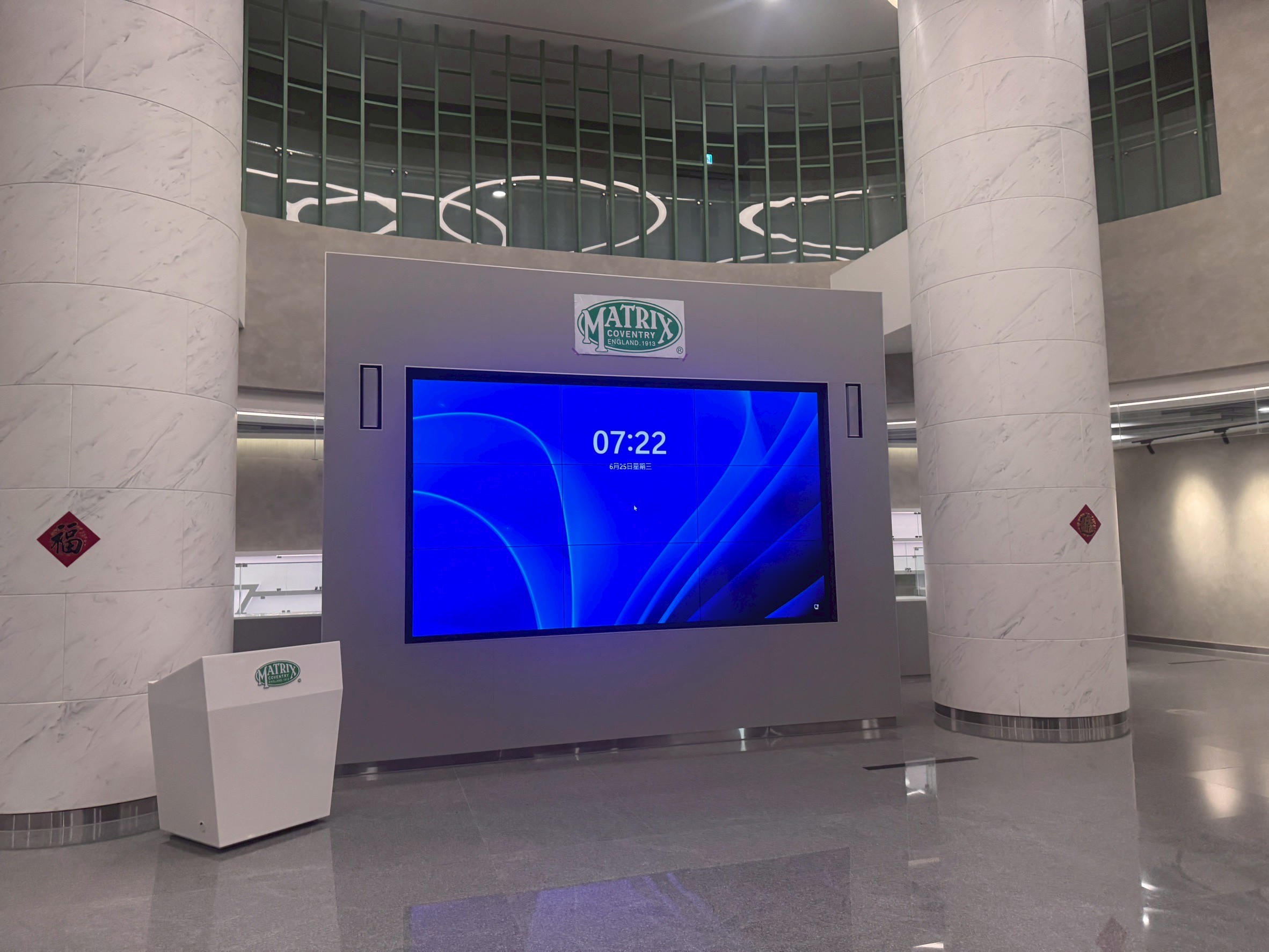 知名精密機械企業大廳整建專案中,我們於迎賓區打造 3×3 全彩高解析度電視牆(9 面拼接),以提升企業門面形象與訪客第一印象。此電視牆作為館內最重要的視覺焦點,不僅展現企業品牌精神,也成為展示資訊、迎賓內容及行銷素材的最佳舞台。